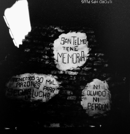 "“Club Atlético” monolito recordando los compañeros que pasaron por el lugar, CCDs (Centro Clandestino Desaparición) funciono desde mediados del año 1976 a diciembre 1977, en los sótanos del edificio de suministros de la policía federal (ciudad de Bs As), por donde pasaron cerca de 1500 personas. http://www.desaparecidos.org/main.html, película 120 HP5 PLUS, cámara artesanal madera f: 168, revelador para papel (vencido).www.ojodelata.com.ar"