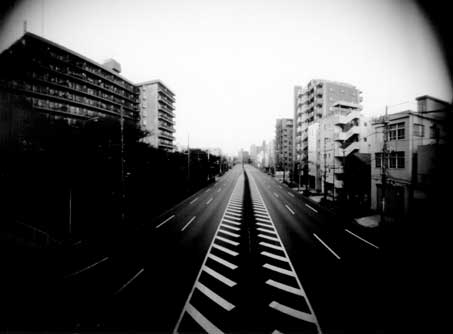 "The car is missing. A handmade pinhole camera. Black & white paper. Fine weather. Before dark. 8 minute exposure."