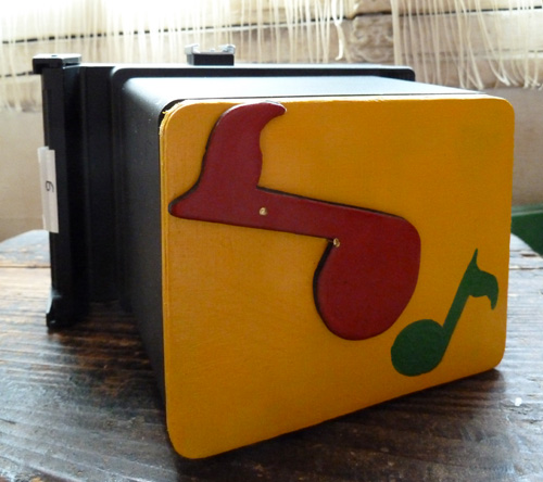 "My new camera pinhole made on a base of polaroïd with an pinhole adaptation. She named "PinPola la la la". Use film pack100"
