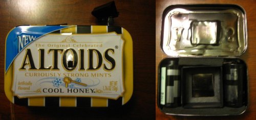 "My "Altoid Cool Honey" tin pinhole camera is constructed using the aforementioned tin, an aluminum soda can, cardboard, 3/4" weather stripping, a binder clip, electrician's tape, scotch tape, black magic marker, sand paper, and the smallest needle I could find. She takes great pictures!"