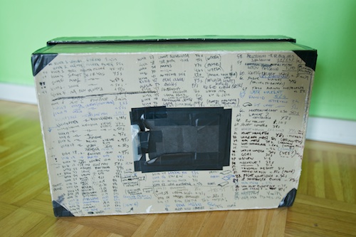 "Self made old shoe box pinhole camera, painted black from inside, double lid to prevent light leaks. Self made pinhole from thin aluminium sheet. I write down all the exposure times and info about conditions straight to camera, it helps to check the correct exposure from this data."