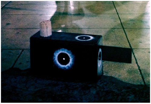 "Es una cámara elaborada con material reciclado de cartón, tiene una distancia focal de 15mm, y un estenopo de .5mm=F30, usa película fotográfica. Por su corta distancia focal los tiempos de exposición son breves. Los efectos son muy interesantes, toda la atención por su luminosidad es hacia el centro del fotograma."
