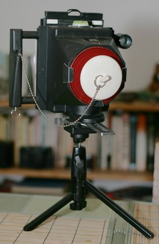 "I converted a cannibalized Cambo Passport Camera into a 4x5 Pinhole Portrait cam using plumbing parts, tin can tops,a magnet and a bathtub stopper for the lens cap. I call it the "Big Stopper Cam".."