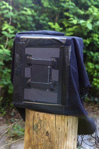 "The pinhole camera is made of a a wooden size 24x30x20. inside this box there's another box that is just a little smaller, which functions as a bellow, so the focal length can almost double. The aperture is about 1mm, and the exposure time was about 4 minutes, exposed on direct positiv paper"