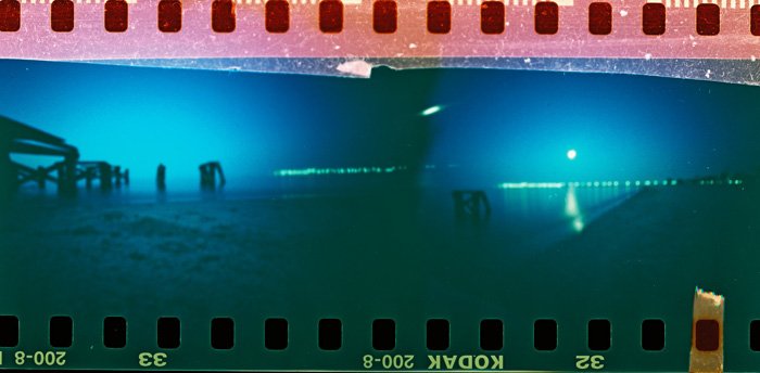 Sopot pier after sunset. Photo taken with a double pinhole matchbox DIY camera. kodak 200 film."