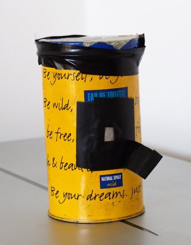 "A canister with diameter approx. 25.6 cm, with a handmade pinhole (from a beer can), perfect for a 9x12 AgfaPan 100 Professional sheet film negative. Exposure ~ 20 seconds; developed in HC110 and scanned. Judging by the results, the pinhole diameter must be close to perfect :) (approx. 0.7mm)"