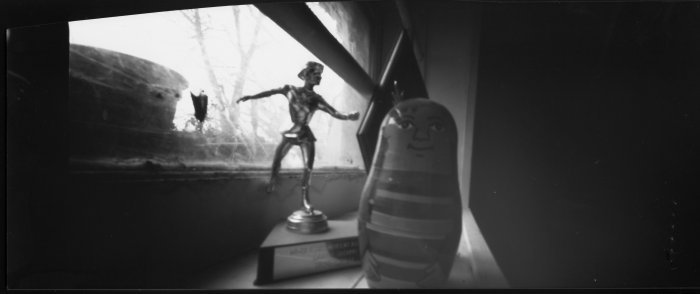 "A skating trophy and nested doll captured in window sill on a cloudy day. Chosen to catch reflective highlights on trophy and expression on doll."