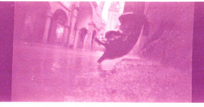 "Cámara hecha con cartón y montada con película de color revelada en proceso cruzado con líquidos de blanco y negro"
