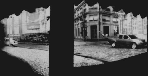 "Mini camera de plástico, formato cilindrico. Negativo em papel fotográfico preto e branco 4 cm x 4 cm."