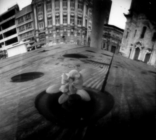 Câmera feita com tubo plástico para embalagem de filmes 35 mm. Negativo em papel PB 4 cm x 4 cm."