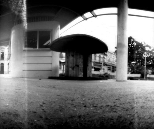 Mini câmera feita com tubo plástico cilindrico. Negativo em papel PB 4 cm x 4 cm."