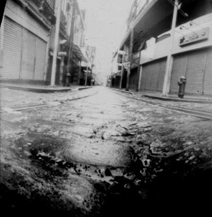 Câmera feita com tubinho de filme. Negativo sobre papel fotográfico preto e branco."