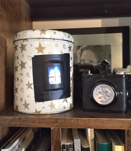 "Camera made from a metal cracker tin with star pattern. Exposure was 50 sec onto Ilford RC Matte paper negative. Negative rephotographed with iPhone, then converted and flipped in Snapseed app (used curves to invert)."