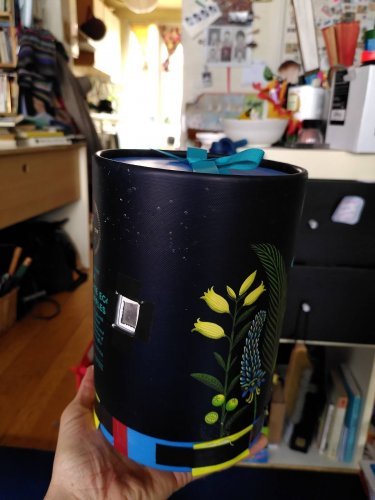 "this is my first go at making a biggish camera out of this marks and sparks Easter egg box. unfortunately it appears to be less light tight than the smaller cylindrical m and s chocolate boxes. so the picture was a bit fogged. got some tweaks to do."
