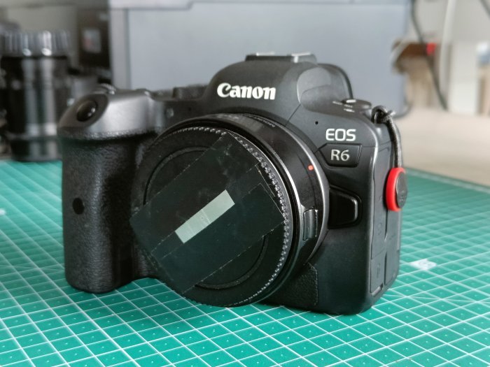 "Digital Camera Canon EOS R6, self constructed pinhole "lens" using a camera lens cap and a hole in an aluminum can. Taken out of hands, 0.4s, ISO3200. Digitally developed in Lrc."