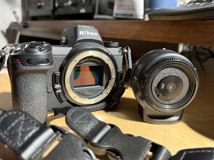 "Nikon Z6 and ZF lens adapter holding an Edmund 200u pinhole. The automatic ISO was very high, but the exposure was about 1/60th of a second, handheld."