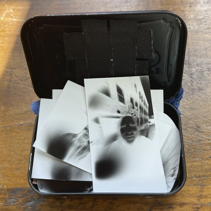 "The first picture is a spooky self-portrait with paper negative and positive image. The second image is a fireworks of light leeks. And the other shows big smiles from Enrico and me on paper negative. All taken with the Altoids box camera at about 3 seconds."