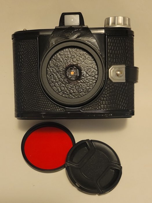 "Agfa Clack converted to pinhole with .35mm hole, Red filter to increase contrast and extent exposure time."