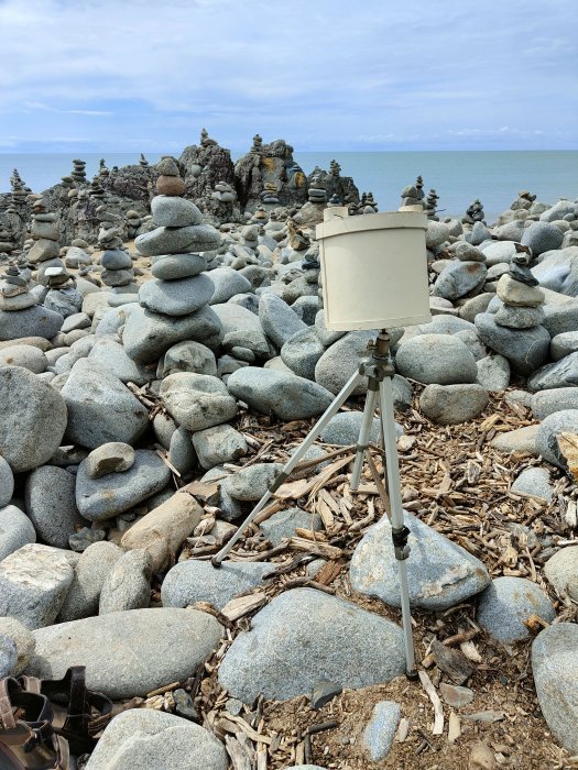 "This beach on the road from Cairns to Port Douglas is a favorite tourist spot, and although the balancing towers of rocks get knocked down from time to time, they always get rebuilt. A perfect subject for a pinhole photograph, and for once the weather was fine!"